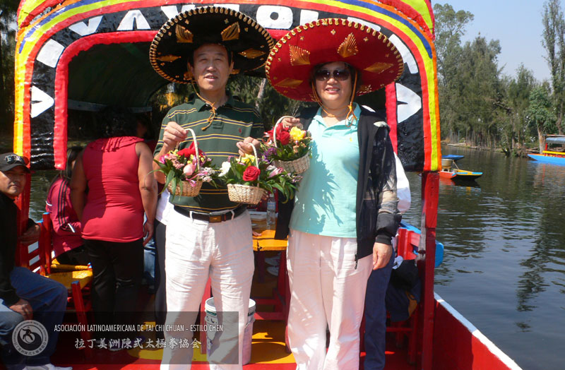 El Gran Maestro Chen Zhenglei, su esposa Shimu Lu Lili y Juan Vásquez paseándose en una lancha en la laguna de Xochimilco. Este paseo fue organizado por el profesor Agustín Martínez y su equipo.