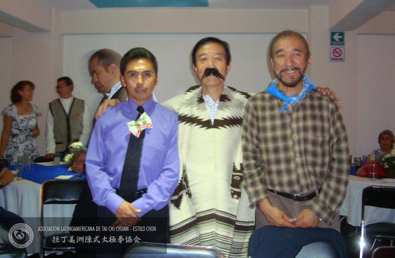 El Gran Maestro Chen Zhenglei con Poncho y bigotes postizos al estilo de los charros mexicanos, abraza simbólicamente a Juan Vásquez y Agustín Martínez, pilares fundamentales para difundir el estilo Chen en Latinoamérica.